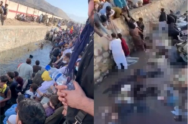 喀布尔机场的出入口外有一条水沟,在爆炸发生之后瞬间血流成河。图/路透,翻摄自推特