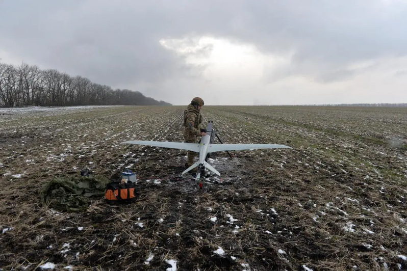 2月5日,在波克罗夫斯克前线作战的乌克兰第25独立空降旅士兵将安装调试好的无人机搬运到发射装置上。新华社发(彼得·德鲁克摄)