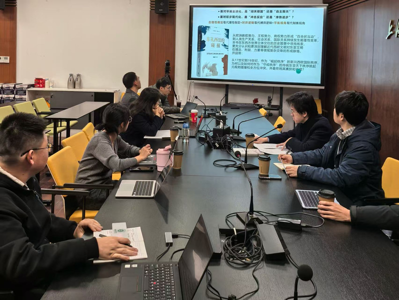 陈康令博士以新著《东礼西法的碰撞:近代东西方文明交锋与秩序冲突》一书展开论述,从历史源流、演进动力、权力行使的不同机制等,来解释东西方两种秩序观的逻辑差异、展现“东礼西法”碰撞的时空嬗变与当代教训,从而思考中国如何为人类发展进步做出更大贡献。国际所叶成城博士在评论环节指出,从“世界时间”的视角重新审视东西方现代化进程,以及对古代礼法关系及其现代性转化的深入讨论,有助于深化文明互鉴研究。