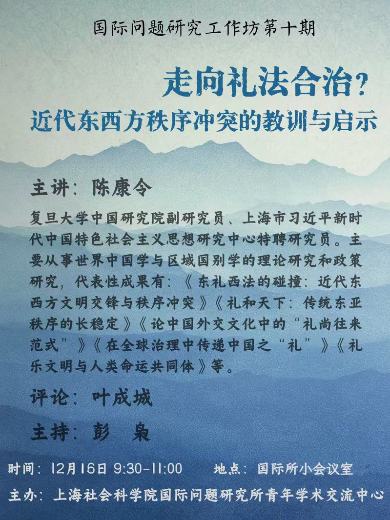 12月16日上午,上海社会科学院国际问题研究所青年学术交流中心举办“国际问题研究工作坊第十期”讲座活动。复旦大学中国研究院副研究员陈康令做“走向礼法合治?近代东西方秩序冲突的教训与启示”演讲。工作坊由国际所彭枭副研究员主持。