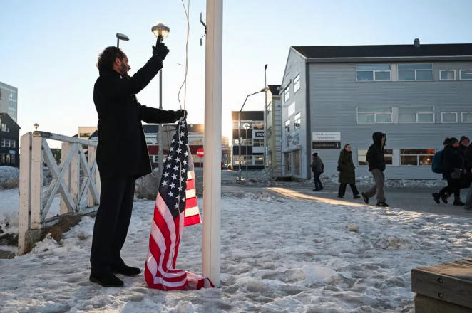 日前一名德国喜剧演员试图在格陵兰岛首府升挂美国国旗引发当地人抗议。图源:GJ